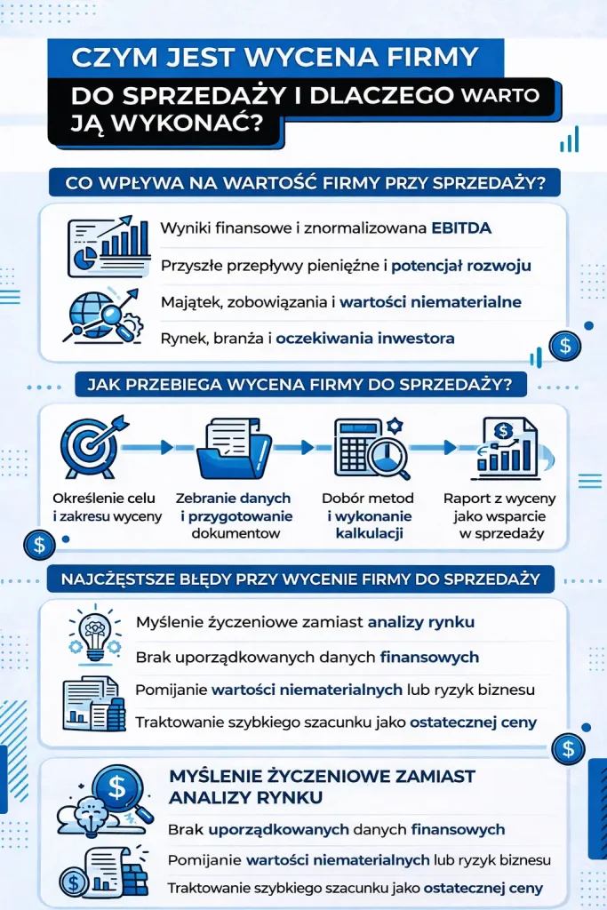 Do najczęstszych błędów należą emocjonalne podejście właściciela, brak uporządkowanych danych finansowych, pomijanie wartości niematerialnych lub ryzyk biznesowych oraz traktowanie uproszczonej wyceny jako ostatecznej ceny sprzedaży. Każdy z tych problemów może osłabić pozycję negocjacyjną i utrudnić przeprowadzenie transakcji.