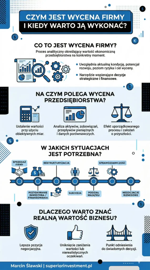 Wycena firmy nie polega wyłącznie na prostym przeliczeniu majątku lub historycznych wyników. To analiza, która ma pokazać realną wartość biznesu w określonym kontekście. W zależności od celu może przyjąć formę pełnej wyceny przedsiębiorstwa, uproszczonej wyceny albo wstępnej kalkulacji wartości. Dobór zakresu prac i metod zależy od tego, do czego wynik ma zostać wykorzystany.